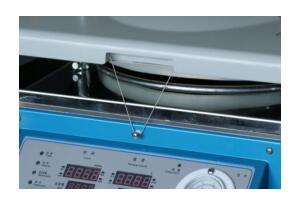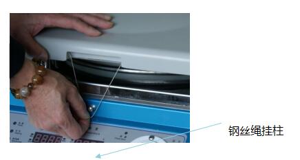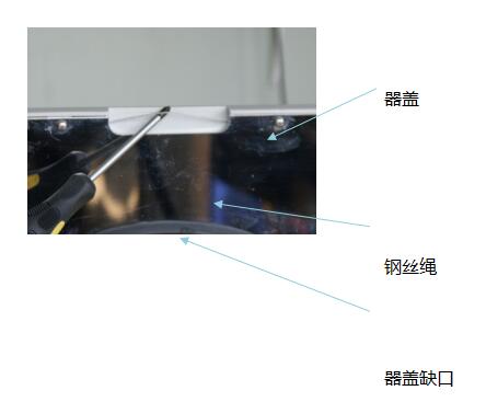 到達(dá)開蓋的溫度后,用左手扶壓住機(jī)蓋,右手手指拉出器蓋正前方缺口內(nèi)的鋼絲繩。(見圖一)