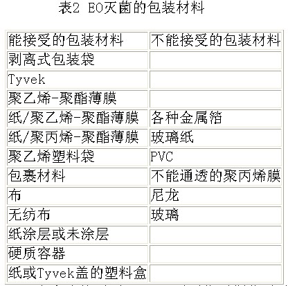 4 EO滅菌包裝材料要求 用于EO滅菌的包裝材料**少需具備以下特點(diǎn):必須允許EO滅菌劑的進(jìn)入;能耐受一定的濕度;能較容易地去除EO殘留。常見(jiàn)的EO包裝材料見(jiàn)表2。
